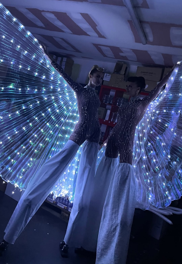 Une échassière parée d’ailes d’Isis LED traverse votre mariage à Fribourg comme une vision lumineuse sortie d’un rêve. Sa silhouette élancée flotte au-dessus des invités, créant un sentiment de douceur suspendue. Par la suite, la lumière qui émane de ses ailes se diffuse sur les visages et intensifie l’émotion du moment.