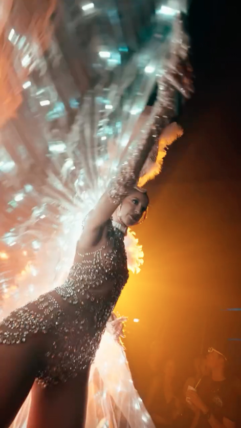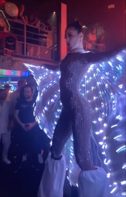 Le mouvement de ses ailes crée des halos colorés qui sculptent l’espace. Ensuite, elle impose une énergie entraînante qui attire naturellement les regards. Son style glamour fusionne avec la technologie lumineuse pour offrir une esthétique moderne et captivante. De plus, son allure inspire immédiatement l’envie de faire la fête, tant son charisme irradie. Elle se déplace avec assurance et crée un lien spontané avec les invités.