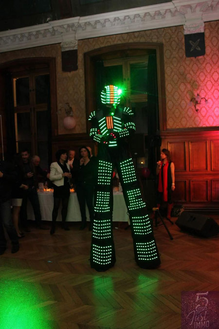La salle s’illumine quand Bryan, robot LED à Neuchâtel entre sur scène, dominant l’espace de sa hauteur imposante. Les invités lèvent instinctivement les yeux pour admirer les jeux de lumière qui dansent sur ses bras et son costume. Les couleurs se fondent avec la musique et créent une ambiance immersive. Les convives commentent entre eux et filment chaque mouvement.