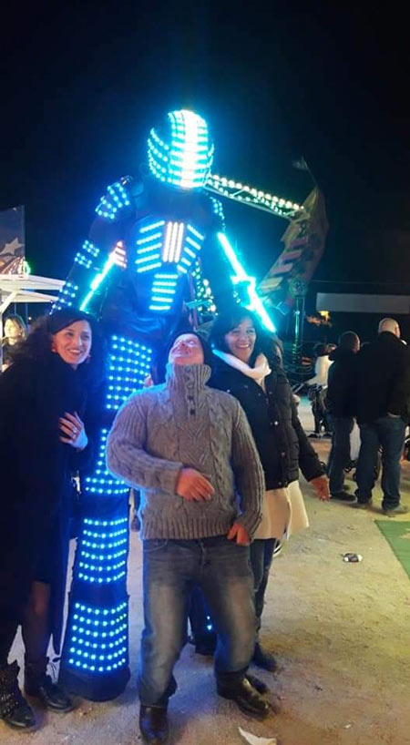 Les convives s’approchent pour mieux voir le spectacle et profitent de chaque détail, des gants lasers aux reflets sur le sol. Les passages successifs maintiennent l’attention et donnent une dynamique continue à l’événement. Les enfants observent avec émerveillement, tandis que les adultes s’enthousiasment pour la créativité et la technique de l’échassier. Dès lors, le spectacle lumineux devient un moment central de la soirée.